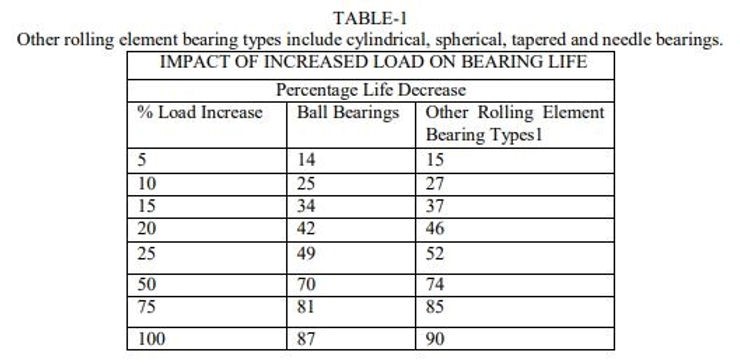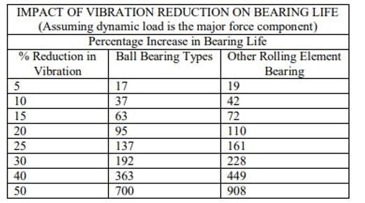 - بررسی ها نشان می دهد که افزایش 10 درصد بار باعث کاهش 25 درصدی عمر یاتاقان برای بلبرینگ ها می شود. بنابراین افزایش جزئی ارتعاش میتواند به افزایش فوقالعاده کاهش عمر تجهیز کمک کند
