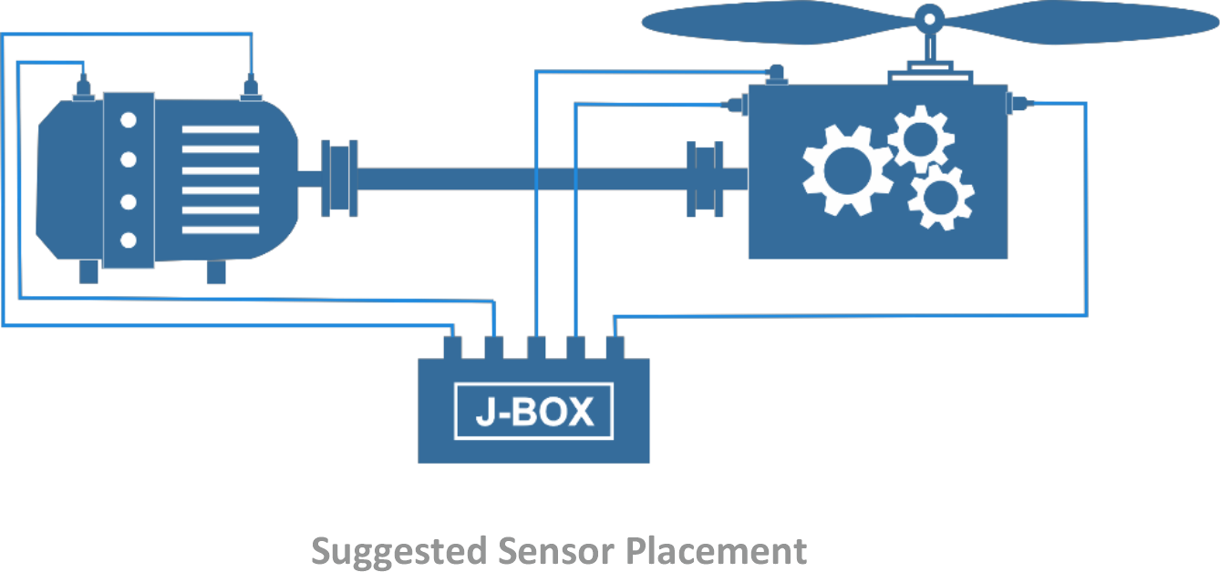 گیربکس: شفت ورودی و خروجی سنسور به صورت شعاعی نصب می شود. این امکان را فراهم می کند که وضعیت بلبرینگ و فن خارج از بالانس (سرعت) پایش شود. یک شتاب سنج محوری اختیاری بر روی شفت ورودی می تواند نشانه خوبی از رانش روی شفت باشد.