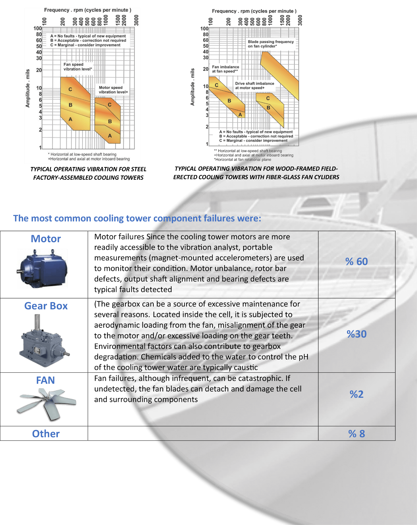 برج های خنک کننده از یک موتور، گیربکس، فن و شفت متصل تشکیل شده اند. گیربکس موتورها را از 1500/1800 دور در دقیقه به دور کمتر برای فن تبدیل می کند. سرعت فن بسته به قطر دارد و از کمتر از 100 دور در دقیقه تا چند صد دور در دقیقه متغیر است. بیرینگ های غلتشی استاندارد هستند و باید با استفاده از شتاب سنج های صنعتی مناسب پایش(آنالیز ارتعاشات) شوند. باید مراقب باشید که تمام کانکتورهای شتاب سنج با استفاده از گریس سیلیکون ضد آب شوند. برای سیستم های مانیتورینگ گزینه LF (فرکانس پایین) باید برای شفت سرعت پایین گیربکس انتخاب شود و فقط شتابسنجهای “X” یا افقی برای سیستم پایش وضعیت تمام وقت (محافظت) توصیه میشوند.