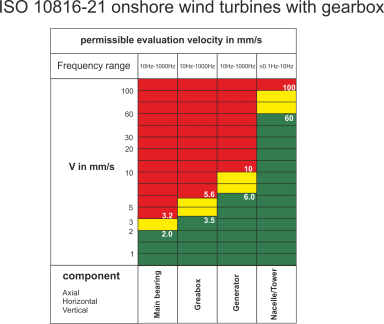 ISO 10816-21 اندازه گیری و ارزیابی ارتعاشات مکانیکی توربین های بادی و اجزای آنها را با اندازه گیری بر روی قطعات غیر دوار مشخص می کند. این در مورد توربین هایی با خروجی ژنراتور نامی بیش از 100 کیلووات اما کمتر یا مساوی 3 مگاوات و مشخصات طراحی و عملیاتی زیر اعمال می شود: استقرار در خشکی، نصب بر روی سیستم های نگهدارنده (برج و فونداسیون) ساخته شده از فولاد و بتن، روتور محور افقی با چندین تیغه روتور، بیرینگ روتور جدا از گیربکس یا ادغام شده با گیربکس، ژنراتورهایی که از طریق گیربکس هدایت می شوند، ژنراتورهای سنکرون یا ناهمزمان با فقط یک عدد قطب ثابت یا قطب قابل تغییر برای تنظیم سرعت، ژنراتور متصل به شبکه برق از طریق مبدل یا مستقیم.