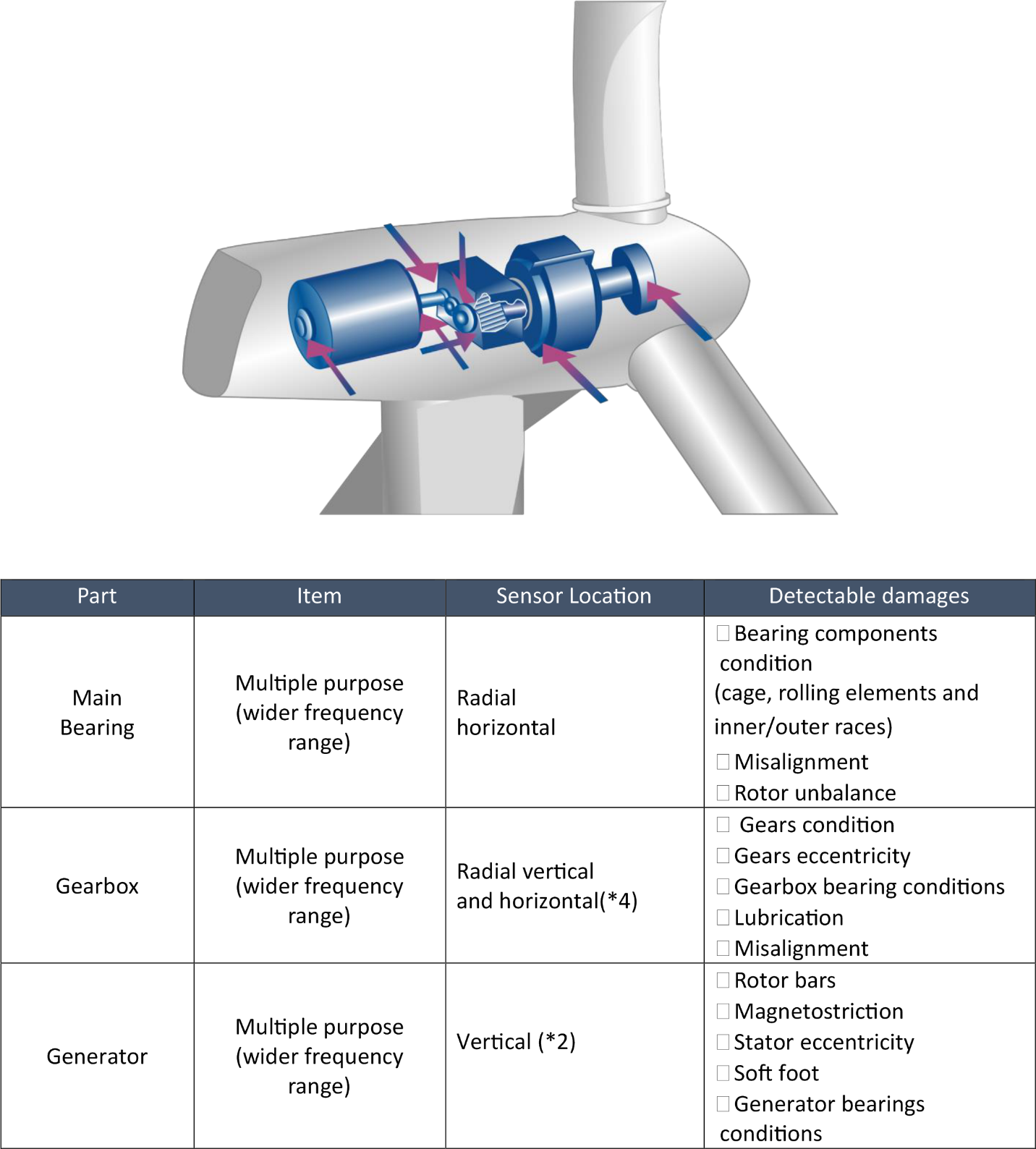 مانیتورینگ ارتعاشات یکی از مهمترین جنبه ها در پایش توربین بادی است زیرا به تعیین وضعیت تجهیزات کمک بسیاری می کند. توربین بادی از روتور توربین، استاتور، بلبرینگ، گیربکس و ژنراتور تشکیل شده است. شکل 1 نشان می دهد که در آن سنسورهای ارتعاش معمولاً برای خواندن داده ها در جهت محوری و شعاعی قرار می گیرند. بسته به محدوده فرکانس قابل اجرا، می توانید از سنسورهای موقعیت (محدوده کم)، سنسورهای سرعت (محدوده متوسط)، یا شتاب سنج (محدوده بالا) برای این اندازه گیری استفاده کنید. این حسگرهای ارتعاش به طور صلب بر روی بدنه مورد نظر نصب می شوند و داده ها توسط دستگاه ارتعاش سنج جمع آوری می شوند.
